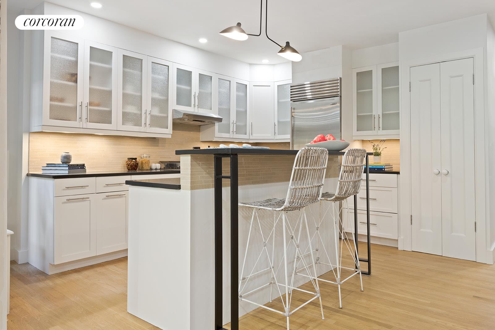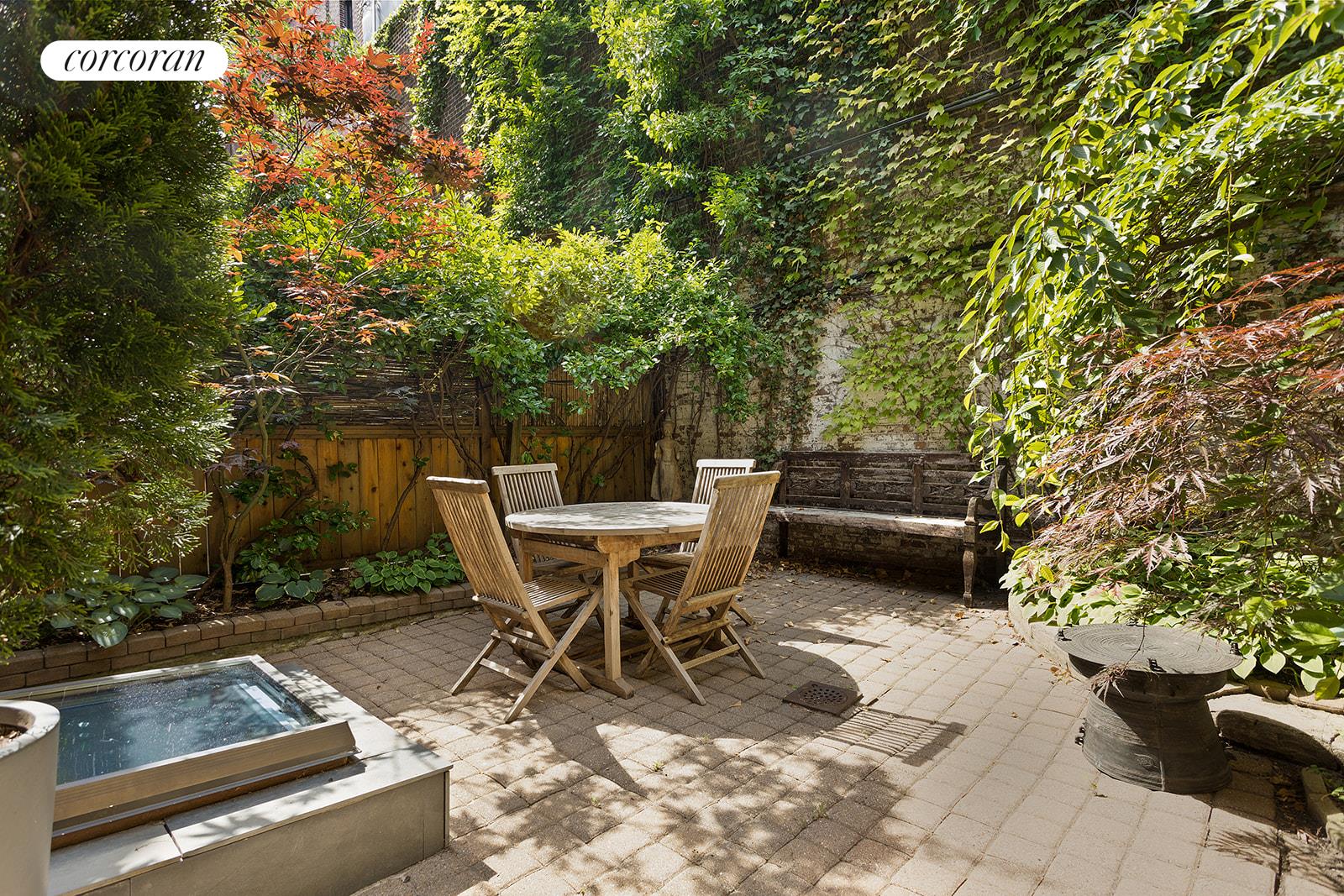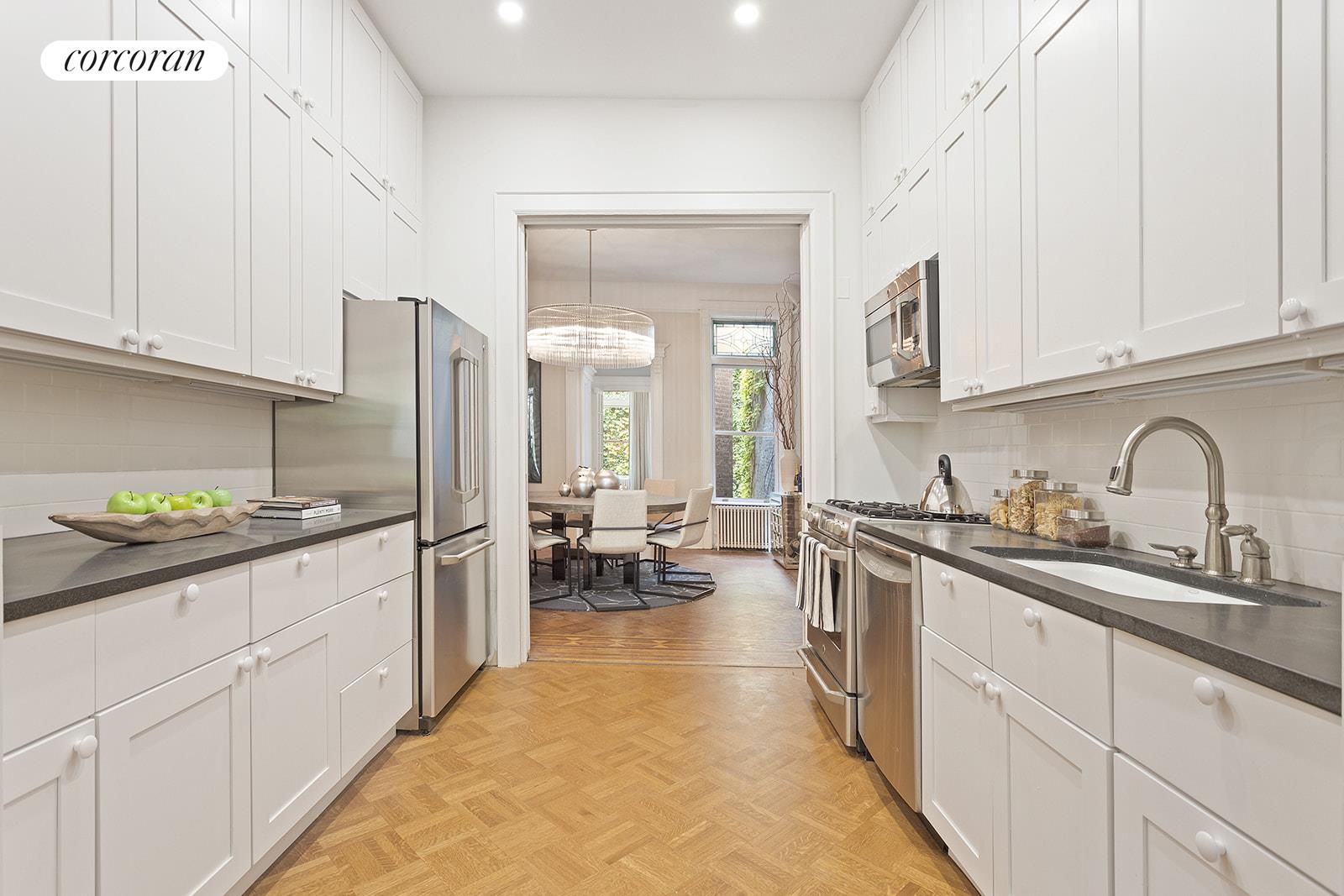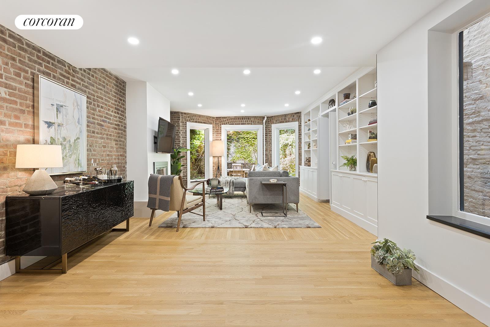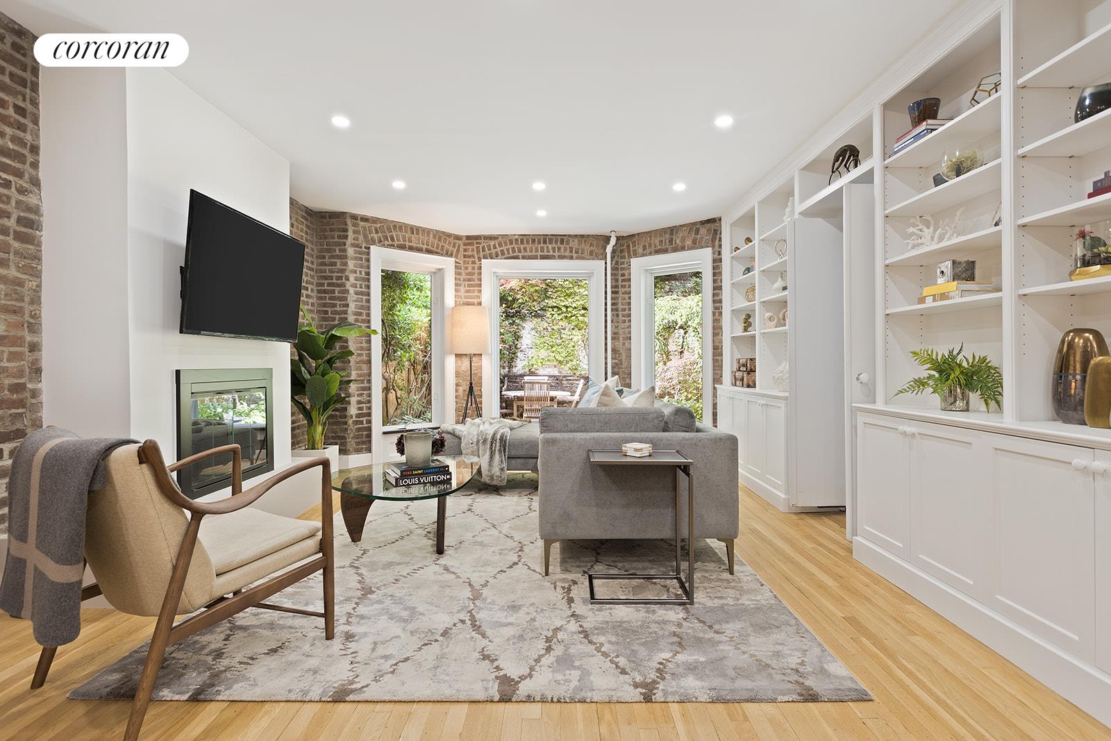This garden and lower apartment features exposed brick and beautifully intricate parquet floors. The spacious living room has a working gas fireplace, built-in shelving and opens into to the walled south-facing garden a lovely sunspot perfect for entertaining or relaxing. The king-sized master bedroom has its own walk-through closet and full bathroom with Carrera marble floors. There is a second full bathroom on this floor with pocket doors and a shower stall. The open-plan kitchen includes a brand new Smeg stove, Bosch dishwasher and a SubZero fridge/freezer. The island, and dining area provide ample space for congregating and entertaining.