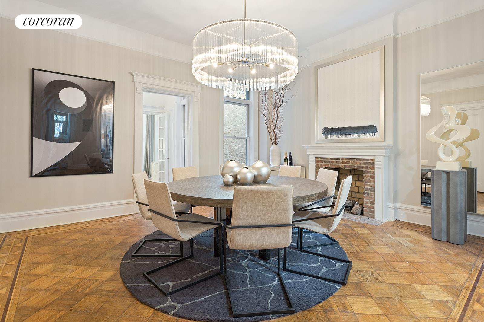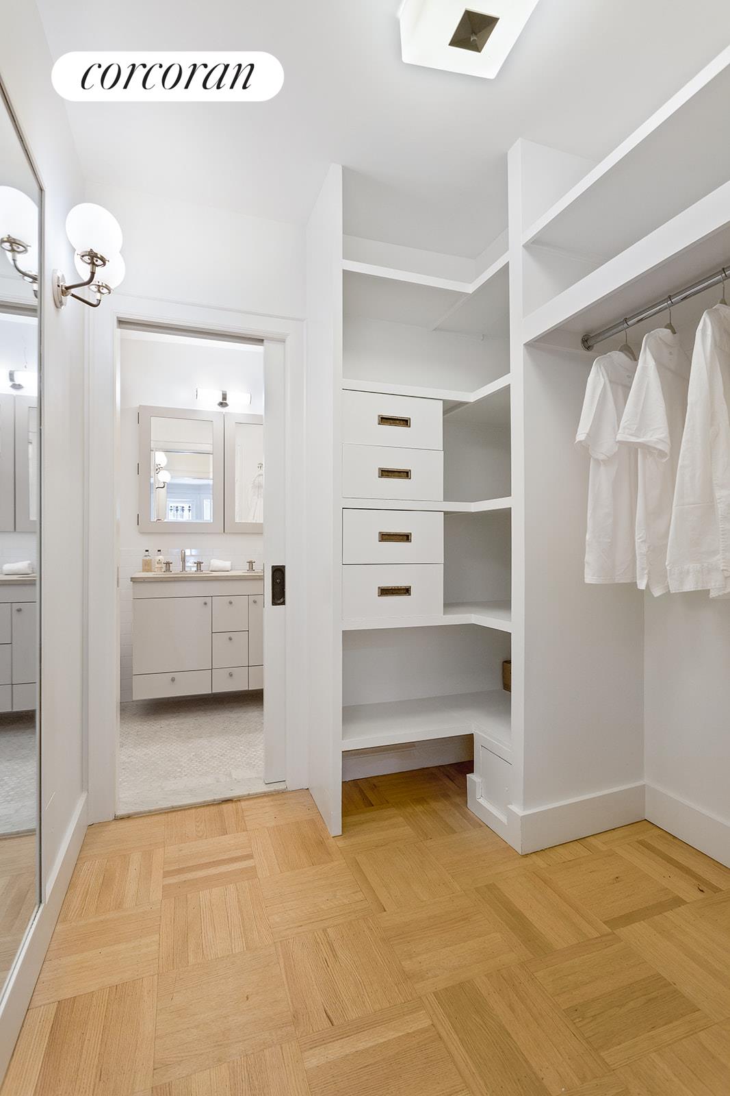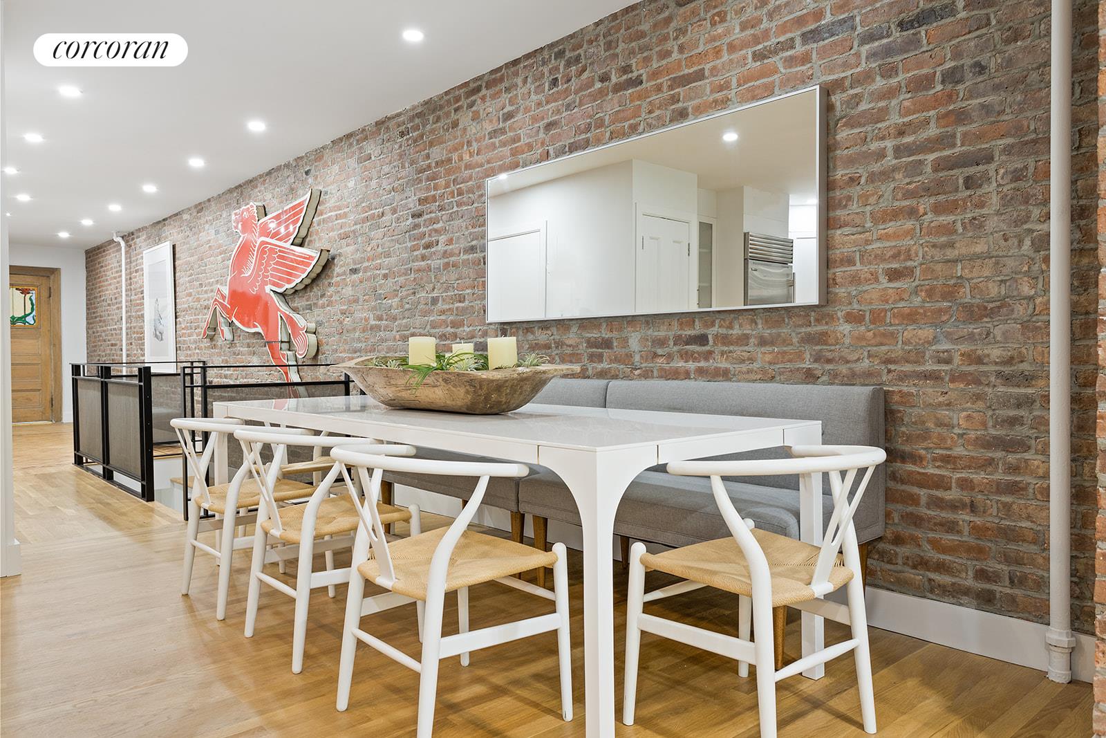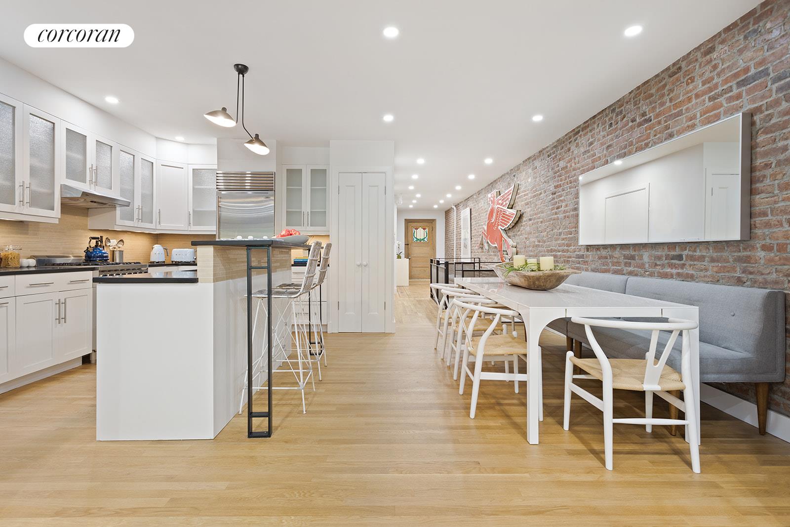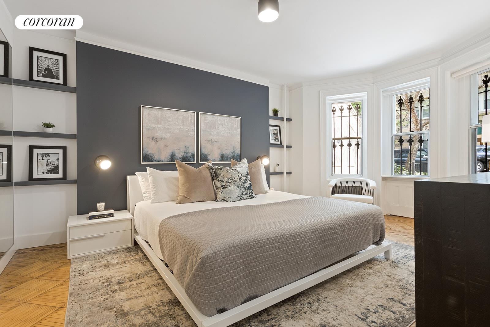 This garden and lower apartment features exposed brick and beautifully intricate parquet floors. The spacious living room has a working gas fireplace, built-in shelving and opens into to the walled south-facing garden a lovely sunspot perfect for entertaining or relaxing. The king-sized master bedroom has its own walk-through closet and full bathroom with Carrera marble floors. There is a second full bathroom on this floor with pocket doors and a shower stall. The open-plan kitchen includes a brand new Smeg stove, Bosch dishwasher and a SubZero fridge/freezer. The island, and dining area provide ample space for congregating and entertaining.