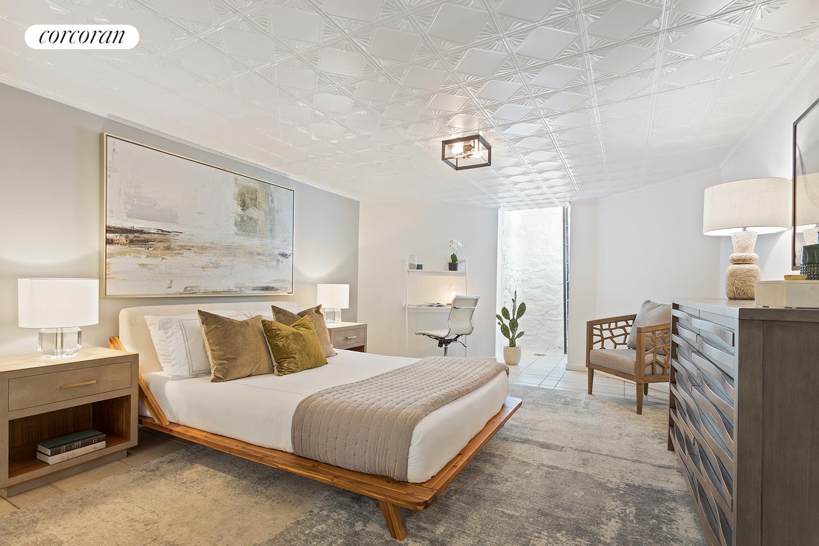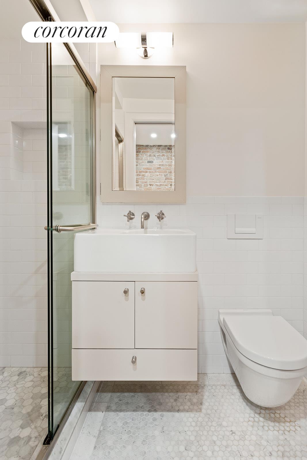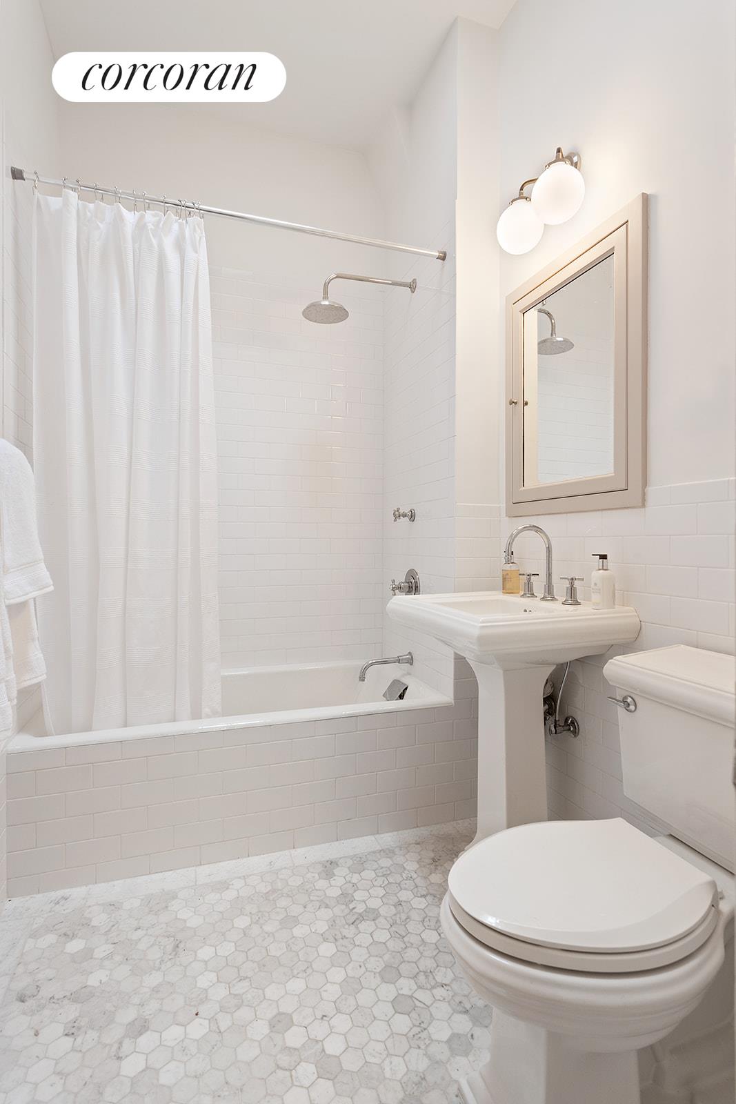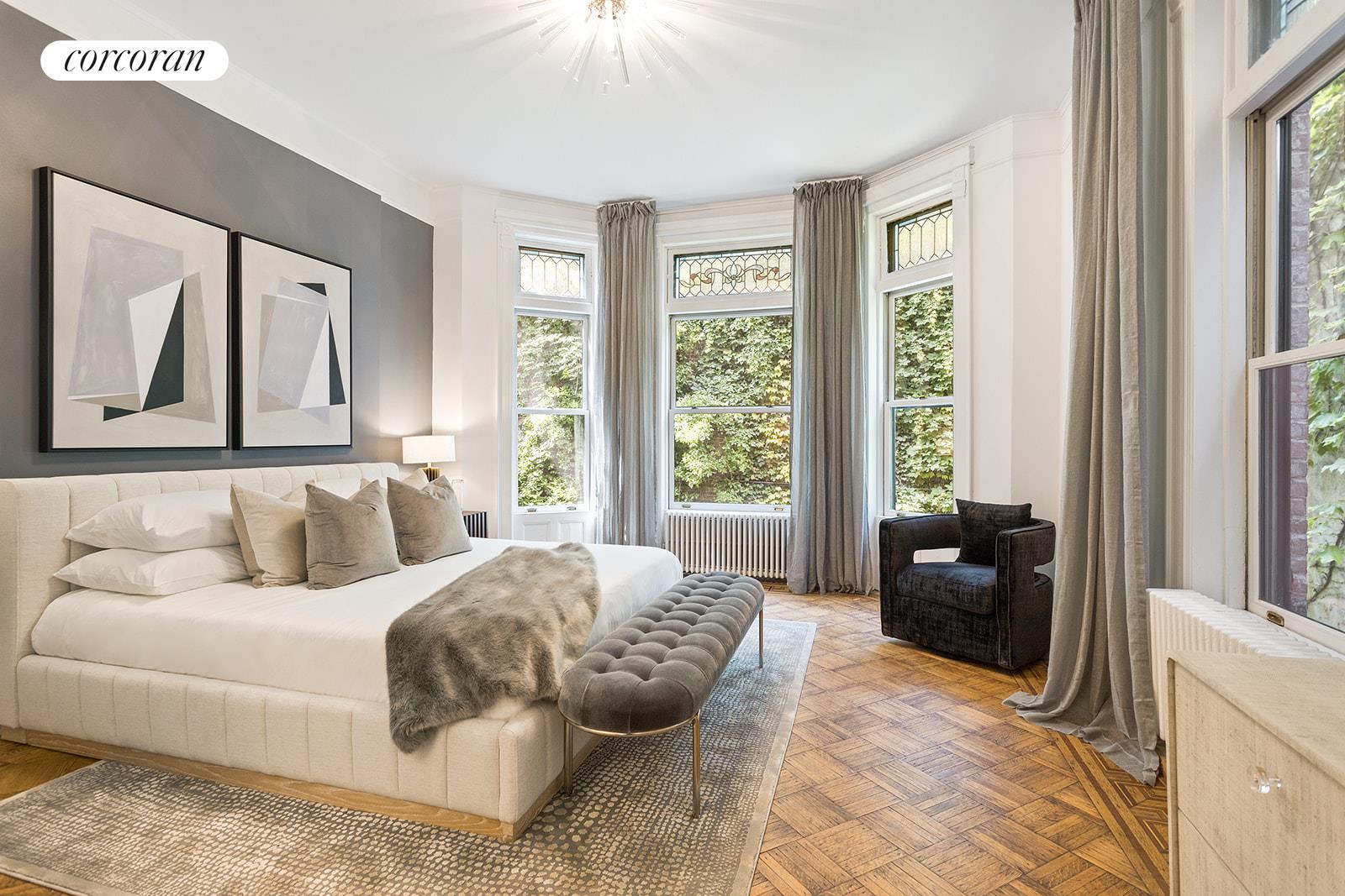 On the parlor level enjoy entertaining in a grand dining room with 11-foot ceilings, a stained-glass window, and a gas fireplace. The chefs kitchen has a marble counter-top, ample custom cabinetry with ceramic handles and stainless-steel appliances. The living room is in the front of the building and has ample built-in shelving, stained glass windows with shutters, and northern light. The bedroom is pin-drop quiet with stained-glass windows, and a beautiful adjacent bathroom with a skylight, Carrera marble floors, Restoration Hardware and Kohler fixtures and subway tile.